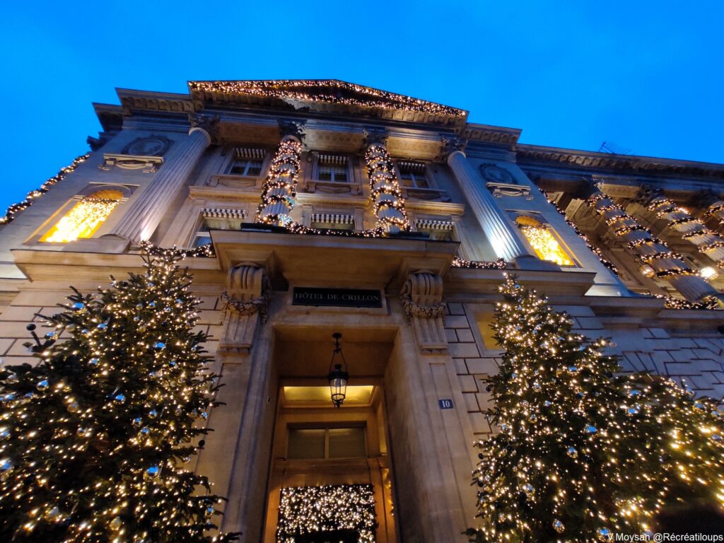 Admirez les sapins géants de la Place Vendôme, et les décorations lumineuses très chics des grands hôtels de la place Vendôme comme le Ritz, et plus loin Le Crillon sur la place de la Concorde.
