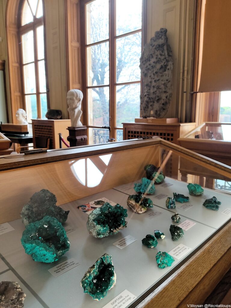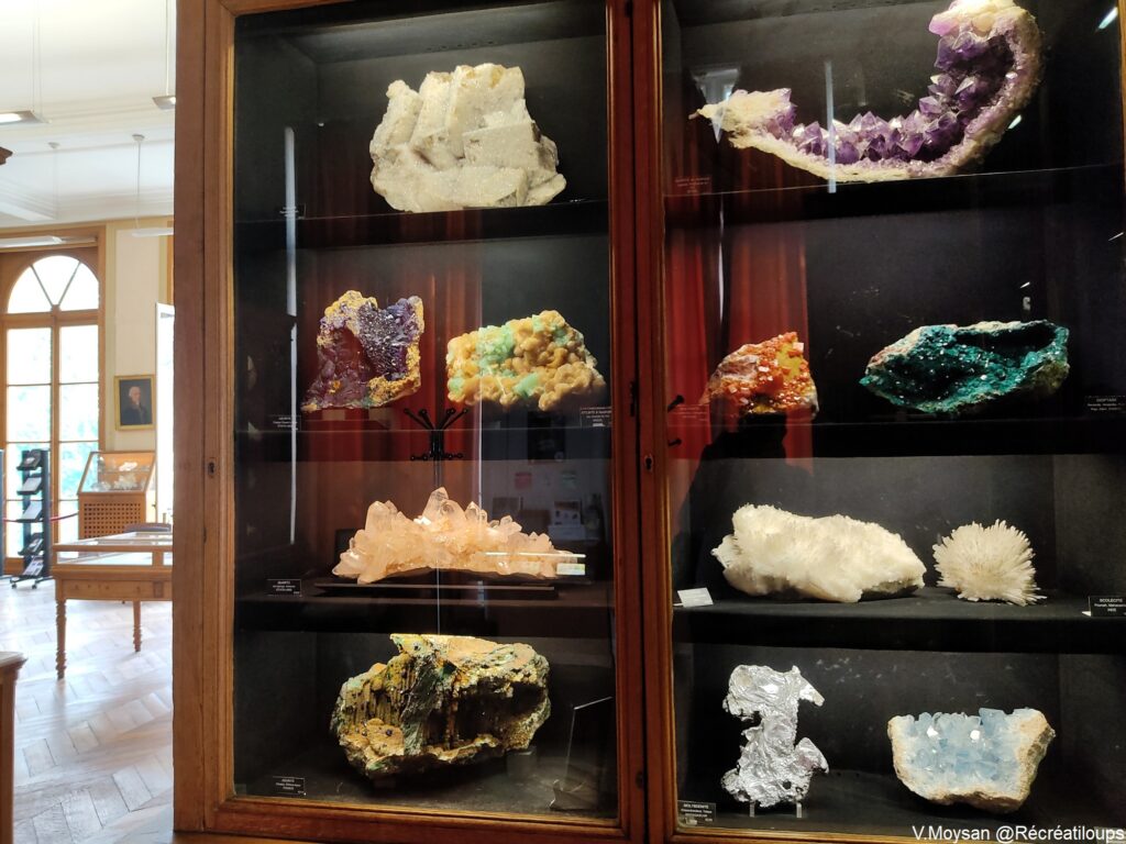 A l’intérieur du Musée, minéraux, gemmes et météorites trônent dans de belles vitrines classées par type, dans d’imposantes salles lumineuses. Ici sont conservées plus de 100 000 échantillons, dont 5000 dans des vitrines, représentant près de 3000 espèces minérales de toutes tailles, couleurs et provenances ; le visiteur ne peut que s’émerveiller.